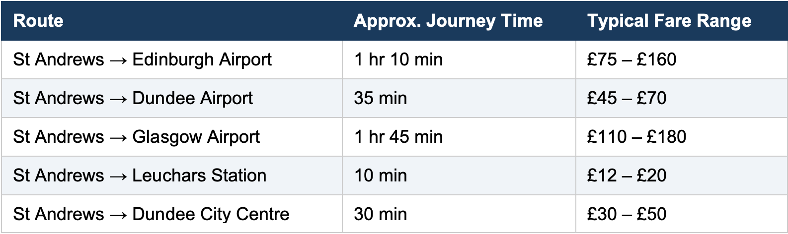 The price of a taxi from St Andrews to Edinburgh Airport varies wildly depending on the time of the year and who you call. Local fares range from £75 to £160 for the same journey — with no way to compare unless you ring round several firms yourself.